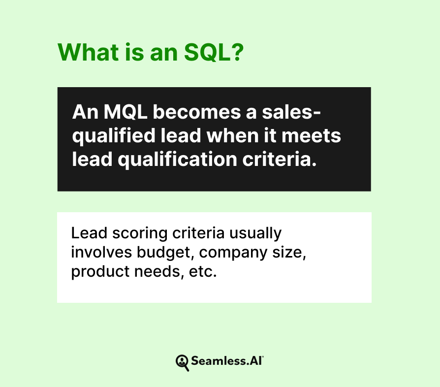 When an MQL becomes a sales-qualified lead, a marketing team concludes that they meet lead qualification criteria. Lead scoring criteria will vary from one company to the next. But qualifications typically include budget, company size, etc. The MQL then moves further down the funnel and becomes a sales-qualified lead.