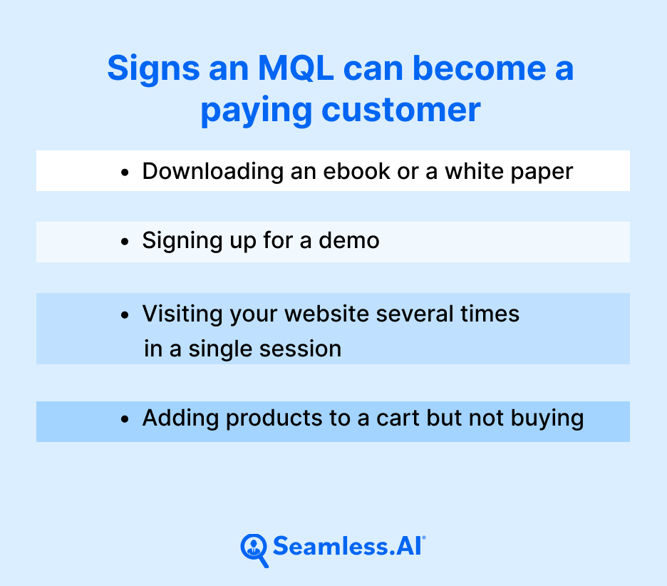 Ultimately, MQLs are leads who are taking all the steps and showing the potential to buy, but they just haven’t made the effort to get more serious and speak to a sales rep.
